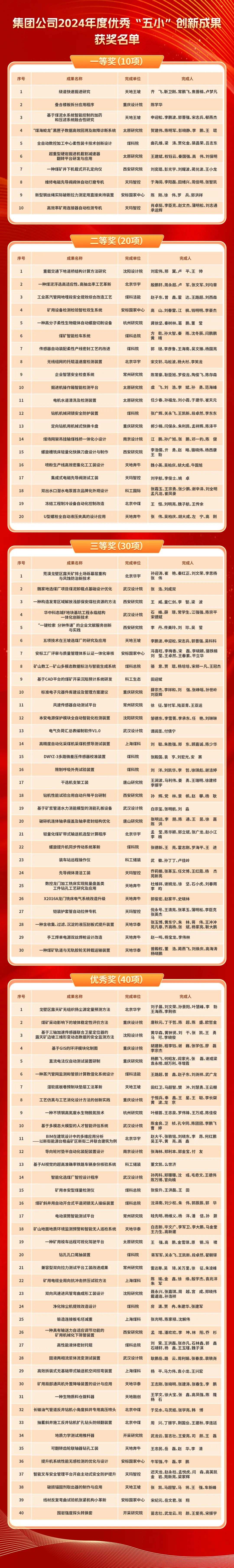为深入贯彻落实中国煤科创新驱动发展战略,充分发挥职工在企业技术创新中的主力军作用,不断激发广大职工的创新热情和创造活力,更好促进成果转化,推动行业技术进步和人才培养体系建设,中国煤科工会开展了以“小发明、小创造、小革新、小设计、小建议”为主要内容的“五小”创新成果评比活动。创新成果涵盖生产经营、技术改造、矿山智能、矿山机电、设计研究、机械制造等方面,共征集成果160余项,经相关专家评审,评选出100项有实用性、先进性、推广性的优秀成果,其中一等奖10项、二等奖20项、三等奖30项、优秀奖40项。